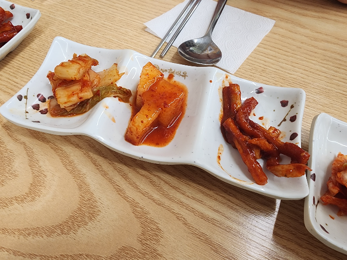 대표 메뉴인 콩나물국밥을 주문했다. 아이가 함께 먹어야 해서 매운탕식과 맑은탕식으로 주문을 했다. 기본 반찬은 김과 간단한 찬으로 구성되었고, 깔끔한 맛이 국밥과 잘 어울렸다.